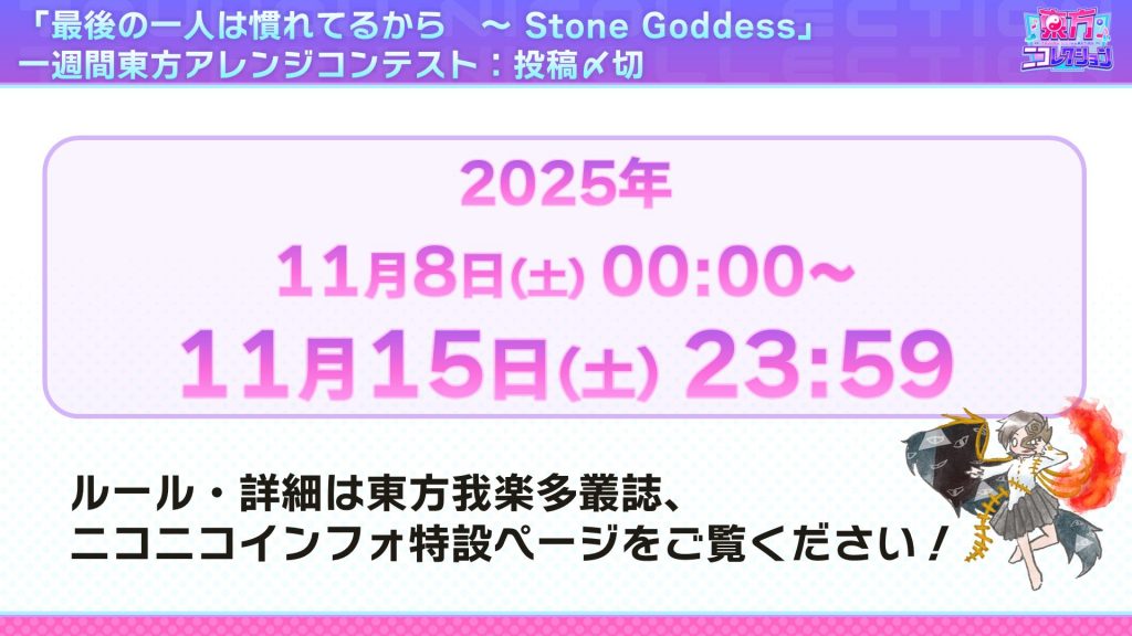 2025年11月のテーマは……一週間東方アレンジコンテスト!課題曲は『最後の一人は慣れてるから ~ Stone Goddess』です! 動画の投稿先はもちろんニコニコ動画です。