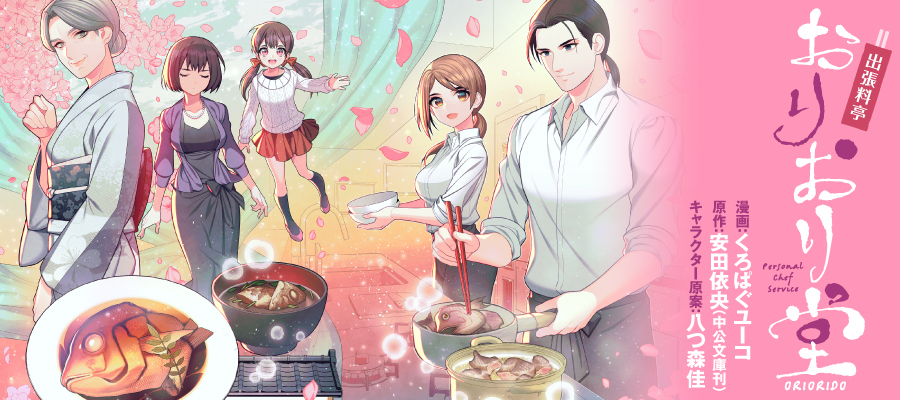「出張料亭おりおり堂」マンガ : くろぱぐユーコ / 原作 : 安田 依央 / キャラクター原案 : 八つ森佳
